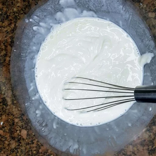 - Kolejno do jogurtu dodajemy 150 ml mleka i dokładnie mieszamy trzepaczką.